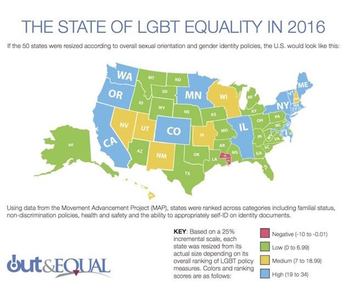 Out and Equal, an organization dedicated to measuring and extending equality within the workplace and business world, used date compiled from across the country to create a map that skews the representation of states in accordance with their approach to LGBT people. The markers used were family status, non-discrimination policies, safety, health, and the ability to appropriately self-identify on ID cards and documentation. The two worst states in the union, it was found, are Tennessee and Alabama.