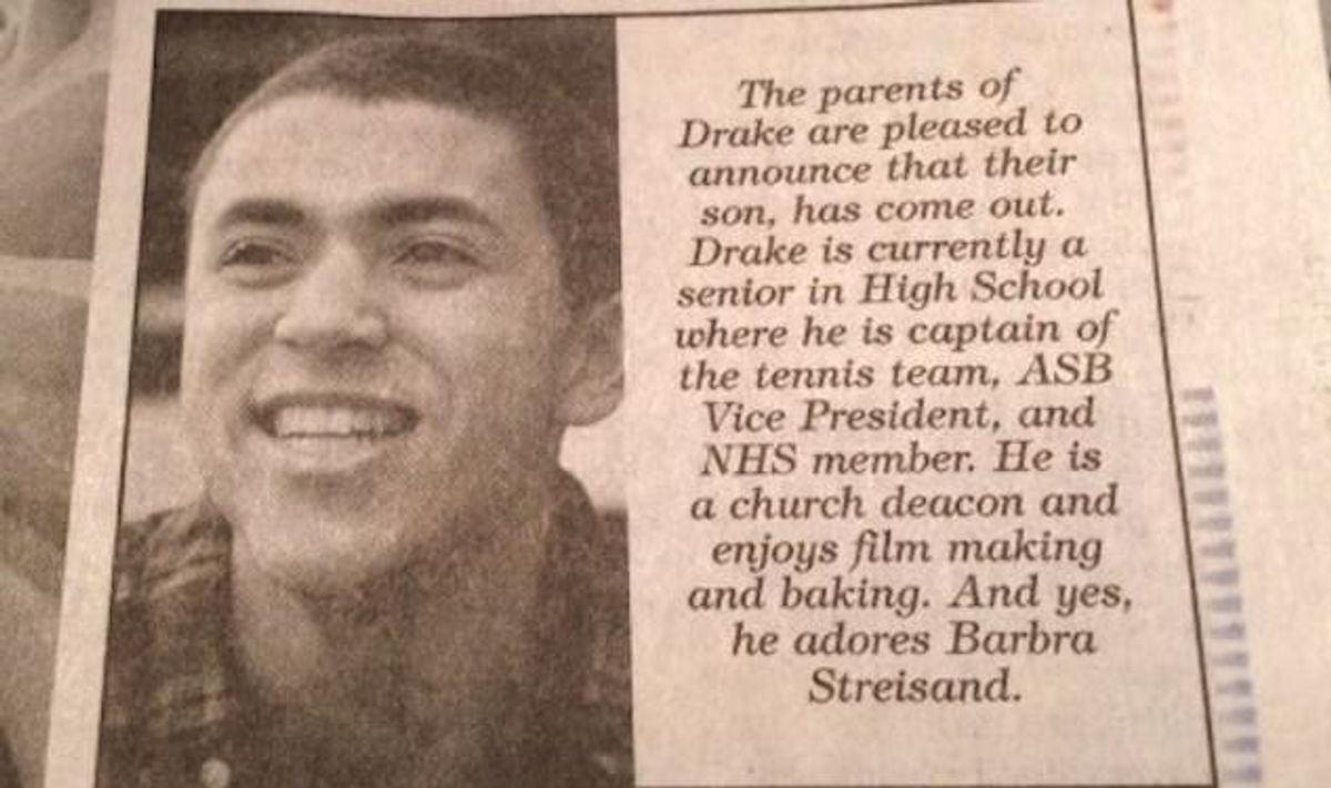 “The parents of Drake are pleased to announce that their son has come out. Drake is currently a senior in High School where he is captain of the tennis team, ASB (Associated Student Body) Vice President and NHS (National Honor Society) member. He is a church deacon and enjoys film making and baking. And yes, he adores Barbra Streisand.”
