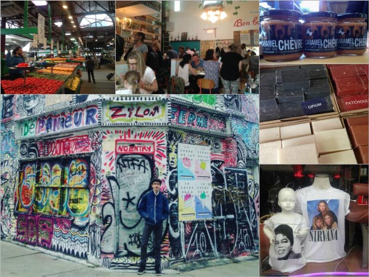 Pictured, clockwise from left: Marché Jean Talon; Agrikol; Goat milk caramel spread and scented soap at Marché Jean Talon; store front on Boulevard Saint-Laurent; Julien and some Zilon street art off Boulevard Saint-Laurent.