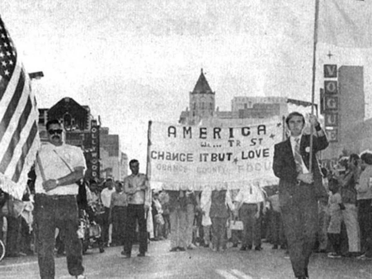 With John Briggs’s Proposition 6 threatening our livelihood, I had become involved as a community activist at the urging of my boyfriend, a board member of the Gay and Lesbian Community Services Center. Asked to march in the Gay Pride Parade to represent the Center, I agreed, innocently accepting the task of walking along one flank of the route with a donation can. Since 1970, a year after Stonewall, gay and lesbian Los Angelenos had celebrated Christopher Street Liberation Day with a march down Hollywood Boulevard and a smallish festival of booths, games and children’s rides on a vacant lot in the heart of Hollywood. For me, this would be my first public demonstration of my gay pride, and I remember the day suffering from LA’s seasonal “June gloom,” yet gleefully joyous in the spirit of the hundreds of brave souls who had turned out.