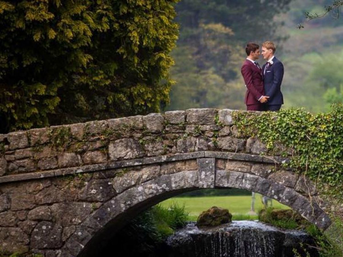 A million broken hearts around the world united over the recent news that Tom Daley and Dustin Lance Black have officially gotten hitched. The couple married Saturday at the Bovey Castle on Dartmoor in Devon, England. They shared the news with images on their Instagram accounts of the beautiful ceremony that brought out 120 of their closest friends and family, as well as the London Gay Men’s Chorus.
