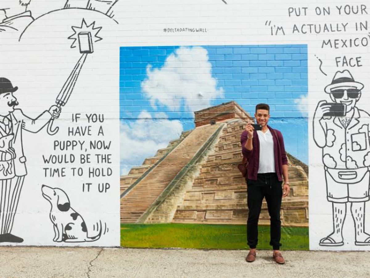 Delta Airlines has teamed up with Tinder to allow singles to express their love for travel. A new mural in Williamsburg, Brooklyn features nine destinations by illustrator Andrew Rae. Pedestrians in the neighborhood can pose in London, Paris, Mexico City, Honolulu, Los Angeles, Pisa, Amsterdam, Moscow, and Zurich for ultimate swipe appeal.