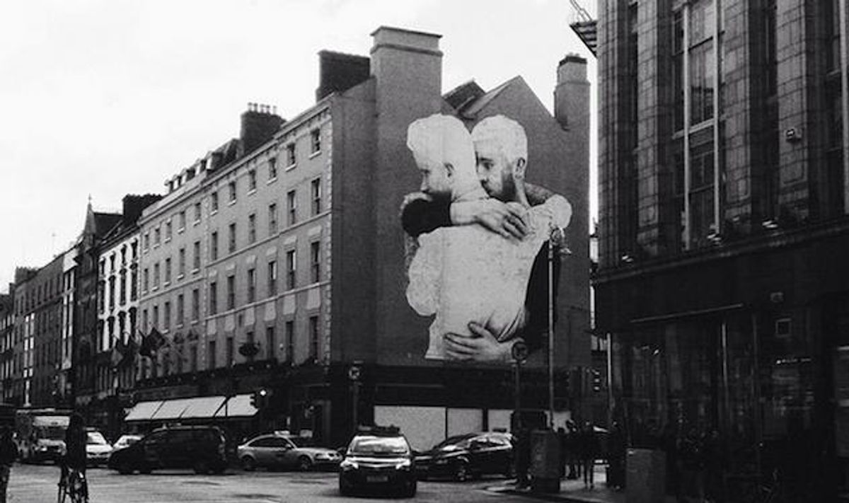 The mural stands four stories high, and was a collaboration between photographer Séan Jackson and street artist (and teacher) Joe Caslin. The goal was to capture the tenderness of love, something that transcends sexual orientation.