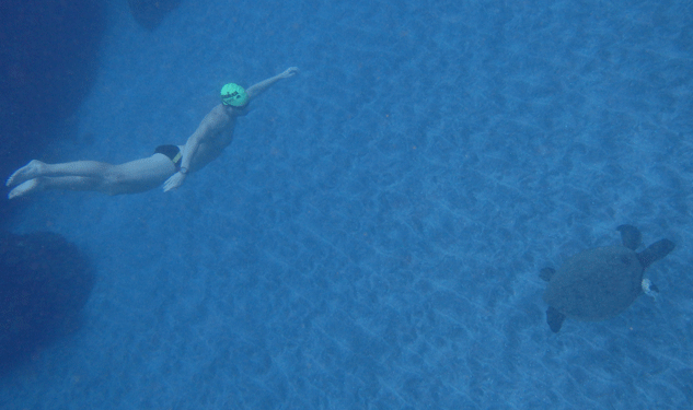 One day, on my routine “out-and-back,” I was swimming along, happy as a clam when up ahead, I saw a dark shadow. Now, as much as I have become desensitized to the eerie darkness of the ocean below me, and as much as I’m known for screaming at kelp when swimming with Los Angeles Tri-Club; I am still cautious about dark shadows moving up ahead. I came to a stop and treaded water, squinting through the fog in my goggles. The shadow got closer. And that’s when I realized it was a Sea Turtle. I swam along with it for a while, watching quietly. I made sure to give the turtle space, enjoying my small commune with nature, from a safe distance. Missing a leg, the turtle slowly took a deep breath and swam beneath out of sight.