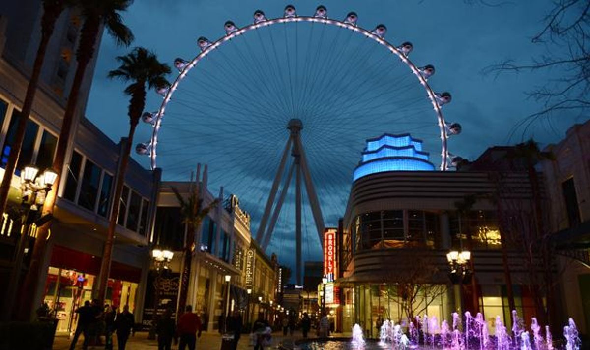 The soon-to-open High Roller is the tallest observation wheel in the world and the centerpiece of Linq, the pedestrian-friendly shopping district just built off the Vegas Strip — the project's giant wheel will now be lit nightly, with alternating colors and designs. The $550 million Linq project was built by Caesars Entertainment and features restaurants and shops like Yard House, Bella Scarpa, and Goorin Brothers hats, some of which are now open. The project's grand opening is just a few weeks away; see more images below. And read more about Linq here.