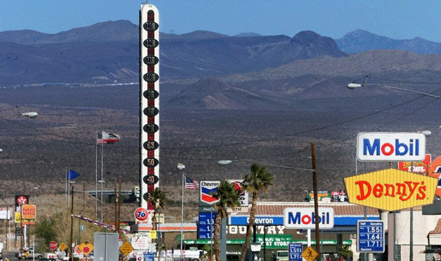 For anyone who routinely drives the nearly 300 miles between L.A. and Vegas, the site of Baker, Calif's. 134-foot tall thermometer is a welcome landmark. The thermometer, though, has not been lit nor has it recorded temperatures since 2009 because a recent owner couldn't foot the $8,000 a month electricity bill. That was depressing news for commuters and tourists, but had a much bigger impact on the tiny town of Baker (pop. 700), which saw many less people stop for food and gas — the city's lifeline.