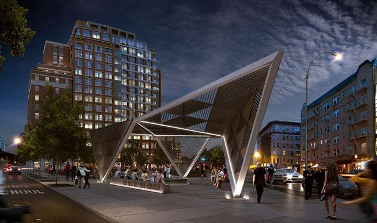 The New York City AIDS Memorial's Board of Directors revealed final renderings for a planned memorial last week. As described in a press release, the memorial will feature an 18-foot steel canopy as the dramatic gateway to the new St. Vincent's Hospital Park at the intersection of 12th Street and Greenwich Avenue in the West Village neighborhood. The memorial also will feature a central granite fountain, granite benches, and a granite paving surface carved with educational and commemorative text. The text will be curated by a team of historians, artists, community members and activists led by Pulitzer Prize- and Tony Award-winning playwright Tony Kushner.