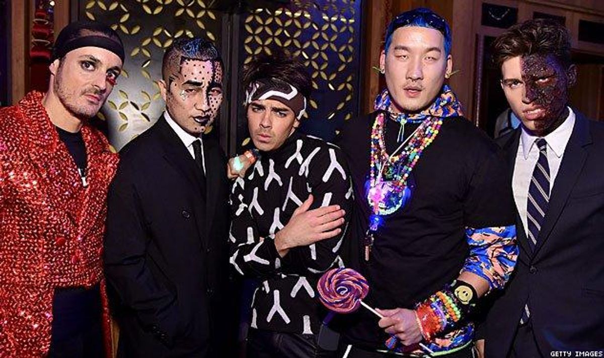 (Second from left) Phillip Lim, Joe Jonas, Richard Chai, and Nolan Funk attend Moto X presents Heidi Klum's 15th Annual Halloween Party.