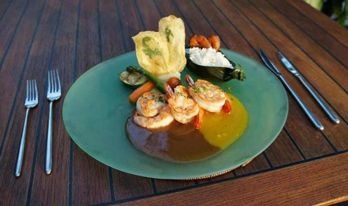 Bay of Puerto Marqués and pays homage to the flavor exchange that took place in the city hundreds of years ago. Some of the menu’s highlights include Thai salad with shrimp tempura, wild mushrooms with vinaigrette of mint and sweet coconut soup and the light and shadow shrimp (above) made with shrimp medallions, rice, fried bananas and its two sauces, ginger-mango and chipotle-tamarind.