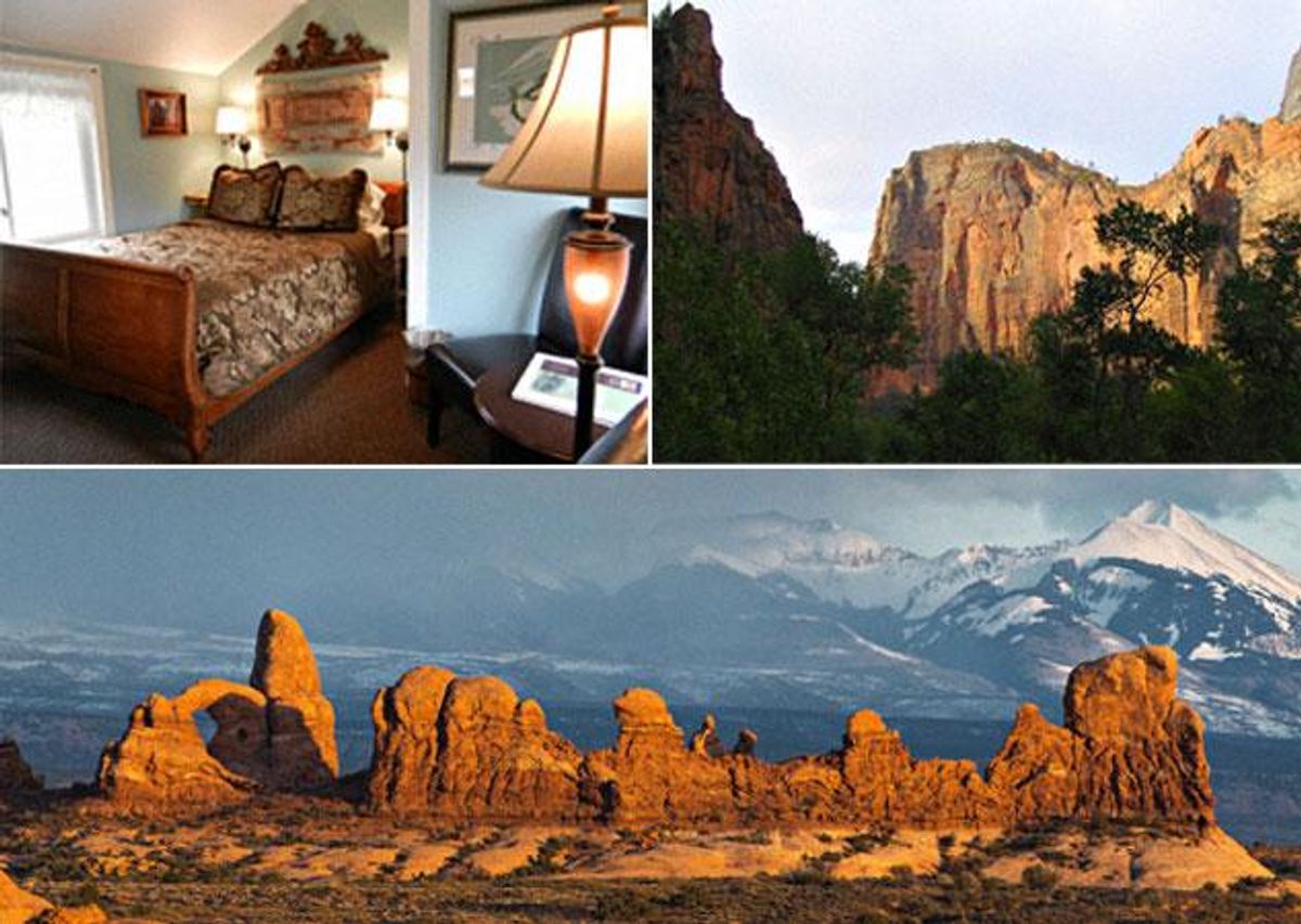 Clockwise from top left: Under the Eaves Inn; Angels’ Landing’s zenith in Zion; sunset at the Windows in Arches. Courtesy of Under The Eaves Inn. NPS (Angels’ LandIng In Zion). Neal Herbert/NPS (Arches).