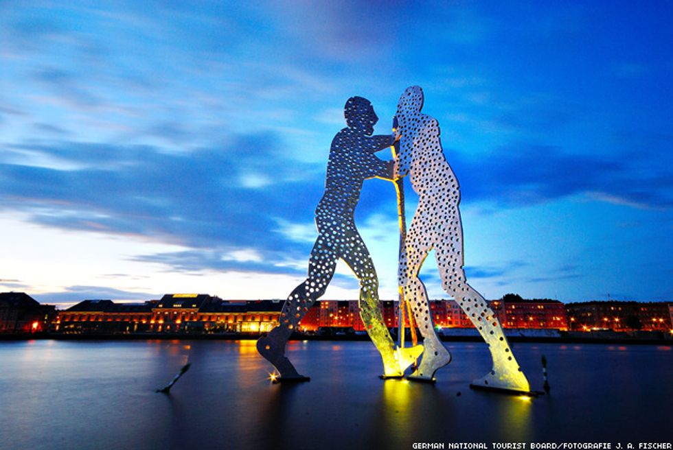 The 30 meter-high Molecule Men sculpture on the Spree River