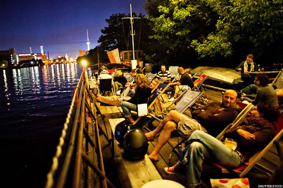 Taking any opportunity to enjoy warm weather, Germans gather at one of the outdoor bars facing the Spree River