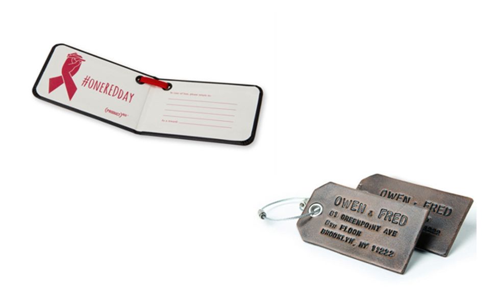 Left: Moleskine (Product) Red Special Edition Luggage Tag to help fight AIDS, $9.95; right: Owen & Fred Custom Luggage Tags, $68