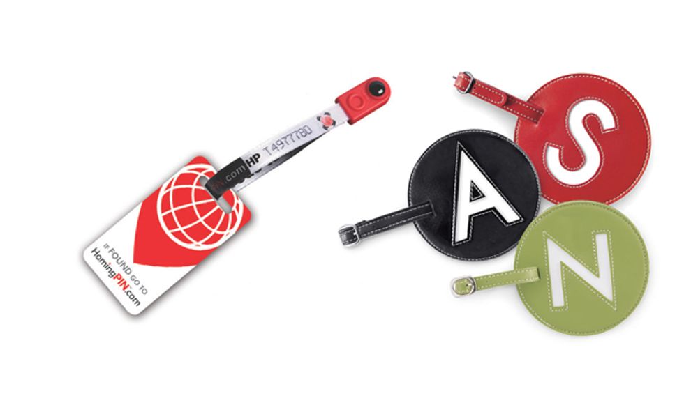 Left: Homing Pin Starter Tag Set, $20 that includes 3 loops & tags, 1 keyring and 12 stickers; Right: Magellan's Initail Luggage Tag, $10 each