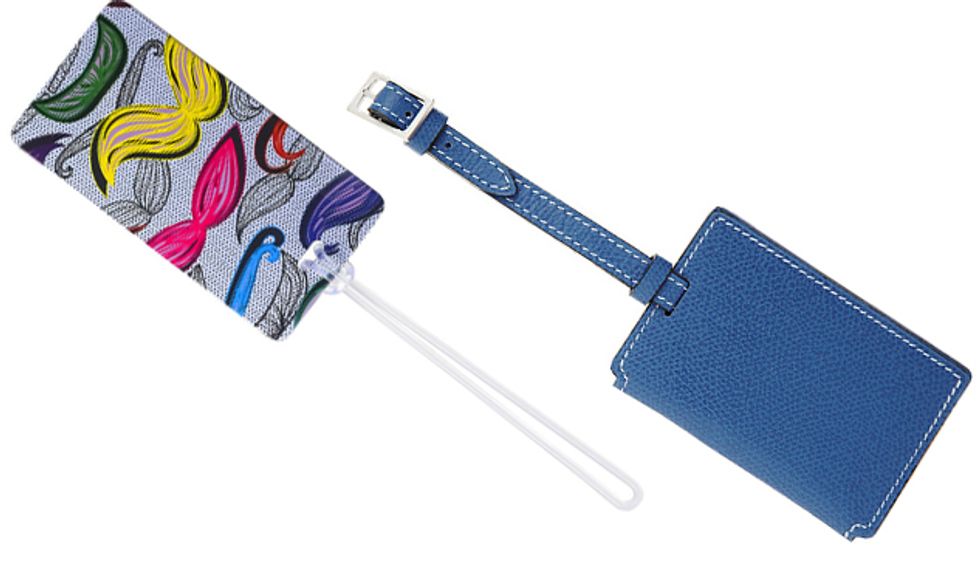Left: Mood Luggage Tag, Pop Art Mustache, $3.49; right: Valextra Leather Luggage Tag, $220