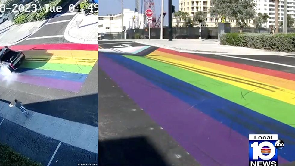 A recently installed Progress Pride mural painted on a street in Fort Lauderdale was defaced by two men in a pickup truck late last month. The entire act was caught on video, and the mayor of the city told local ABC affiliate WPLG the city will track down those responsible for the vandalism.