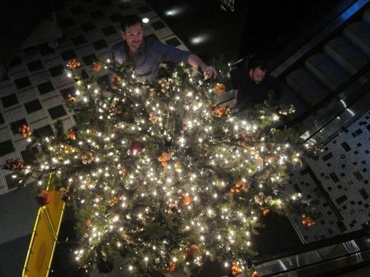 Look up! Yes, those are seven upside down Christmas trees suspended from the 90-foot rotunda of Liberty Hotel located in the Beacon Hill neighborhood of Boston. But don't worry, you haven't had too much eggnog, it's all intentional. John LaRoche, creative director and owner of blueGuava Design Group (based in the South End neighborhood), and his team installed the unexpected holiday display with plenty of safety in mind. And those 9-foot-tall trees don't look any worse for wear.