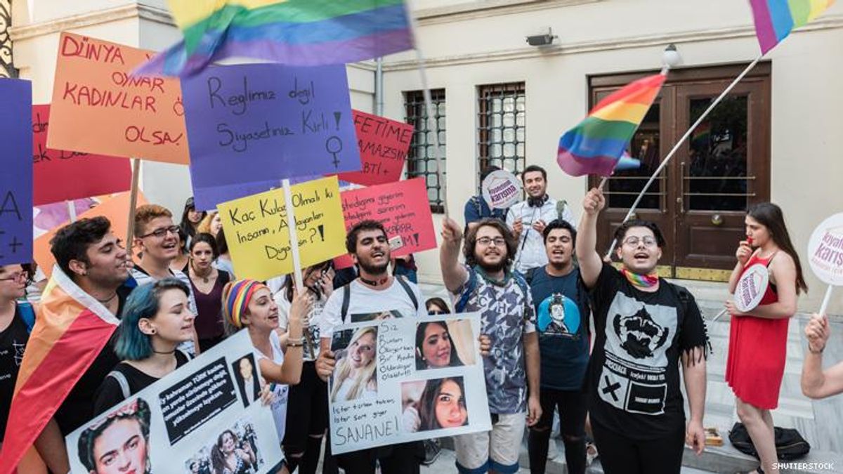 Above Turkish LGBTQ+ supporters march in Istanbul in 2017.