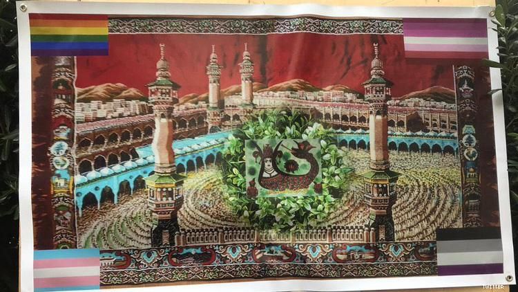 The art piece (below) has queer flags (the rainbow, lesbian, ace, and transgender flags) in the corners of a depiction of the Kaaba, a building at the centre of the Masjid al-Haram (the Great Mosque) in Mecca, Saudi Arabia, considered one of the most sacred sites in Islam. In the center is a representatio of the mythical creature Shahmaran, a half woman and half snake.