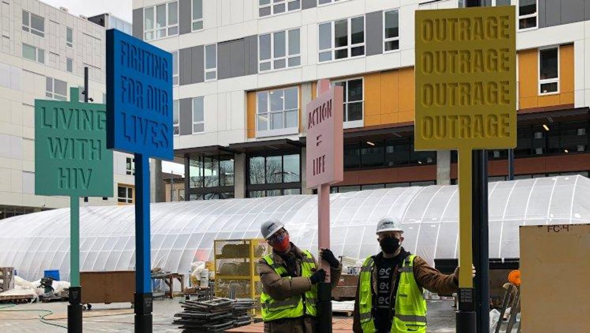 The second, We’re Already Here by the Civilization design practice, consists of three groupings of sculptures shaped like protest signs and bearing messages that evoke historic moments in the crisis, such as “Dream Big End AIDS,” “Women ACT UP,” and “Stop the Stigma.” The title comes from a quote from Seattle activist Brian Day, who was leading a demonstration to build support for an AIDS care center in the area. A Seattle Times reporter asked him about neighborhood residents who feared having people with AIDS in the area, and he replied, “We’re already here.” Installed in February, the sculptures are located in the plaza above the Capitol Hill Link light rail station and on the adjacent corner of Cal Anderson Park.