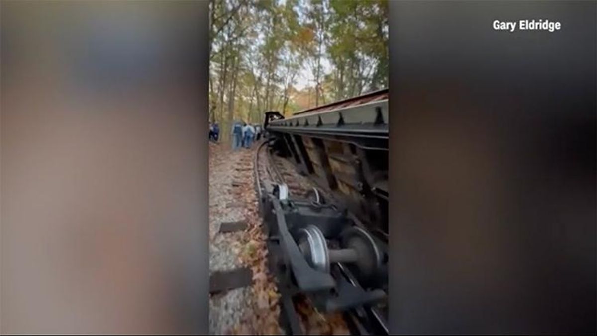 A video he took of the toppled train shows several bright red train cars flipped on their side, some with their wheels detached and sitting on the track.