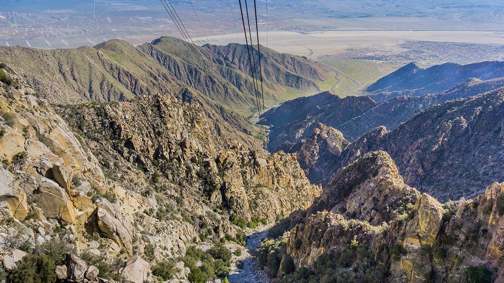 The Palm Springs Aerial Tramway opened in September 1963 and is the largest rotating aerial tramway in the world. It travels over 2.5 miles from the desert floor in Palm Springs to the Mt. San Jacinto State Park and Wilderness. The tram passes through five different biozones during the trip. The floors of the cars rotate twice during the 12-minute ride to the Mountain Station at 8,516 feet above sea level.