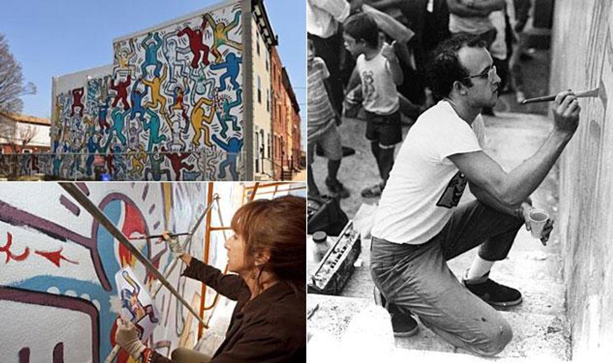 The playful "We the Youth," located in South Philadelphia, will survive another 26 years, hopefully. With funding from the Mural Arts Program and the Keith Haring Foundation, recent damage to the mural's wall is currently being fixed. Officials say the mural "is the only Keith Haring collaborative public mural remaining intact and on its original site." It was created in collaboration with CityKids of New York and Brandywine Workshop.