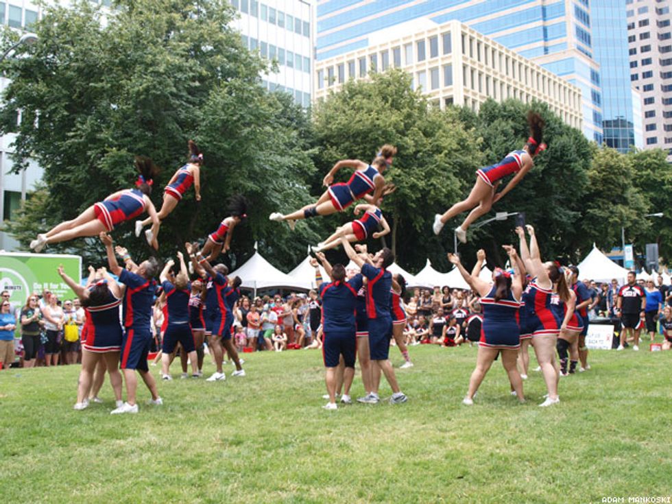 The crowd watches a cheerleading squad.