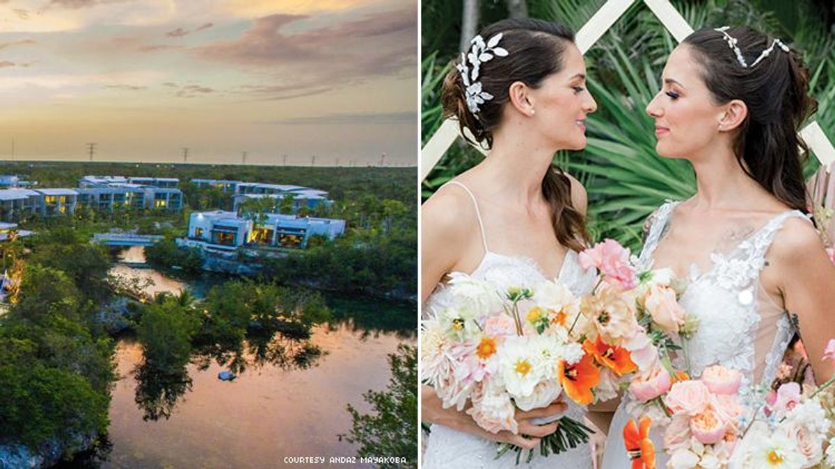 When Andaz Mayakoba Resort opened in Mexico’s Riviera Maya in late 2016, it immediately became a hot wedding destination for same-sex couples. The acclaimed, gated Caribbean beachfront eco-resort (just north of Playa del Carmen) is situated on 590 acres surrounded by oceanfront, lush tropical forests, and breath-taking preserved mangrove-laden lagoons.