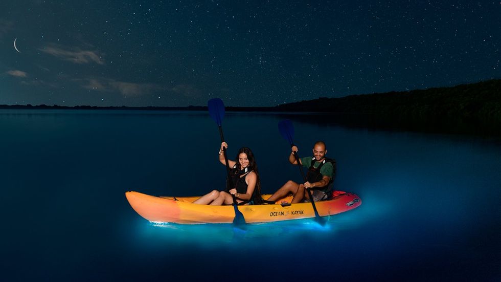The Bio Bay is a rare breeding ground for billions of single-celled organisms called dinoflagellates. (There are three bioluminescent sites located in Puerto Rico, a testament to the Caribbean island’s rich biodiversity.) Classified as a form of algae, dinoflagellates in large concentrations can alter the color of water. Some types, like a “red tide,” can be toxic, but the eco-friendly kind in the Bio Bay simply sparks dazzling blue-green light when agitated. Invisible to the eye in the daytime, the dinoflagellates create an Avatar-esque wonderland at night for living things swimming through its waters. Protected from the sea by a coral reef, the bay has a unique blend of ingredients known to have beneficial glow-ups for hair and skin, the tour guide claimed as we motored toward our destination.