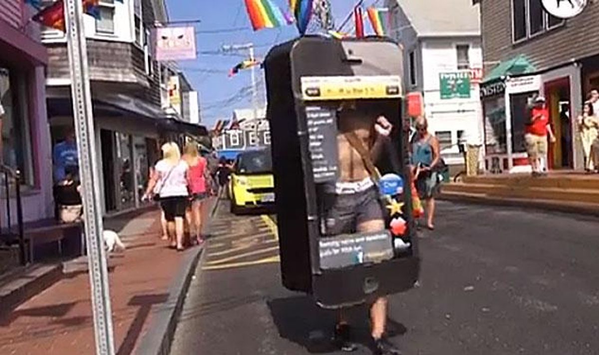 Just when you thought Halloween couldn’t come soon enough, a giant cell phone has been spotted wondering the streets of Provincetown, Mass. The man wearing the costume, set to resemble a giant Iphone open to a Grindr app profile, has been wondering the streets hoping to raise both eyebrows and awareness.