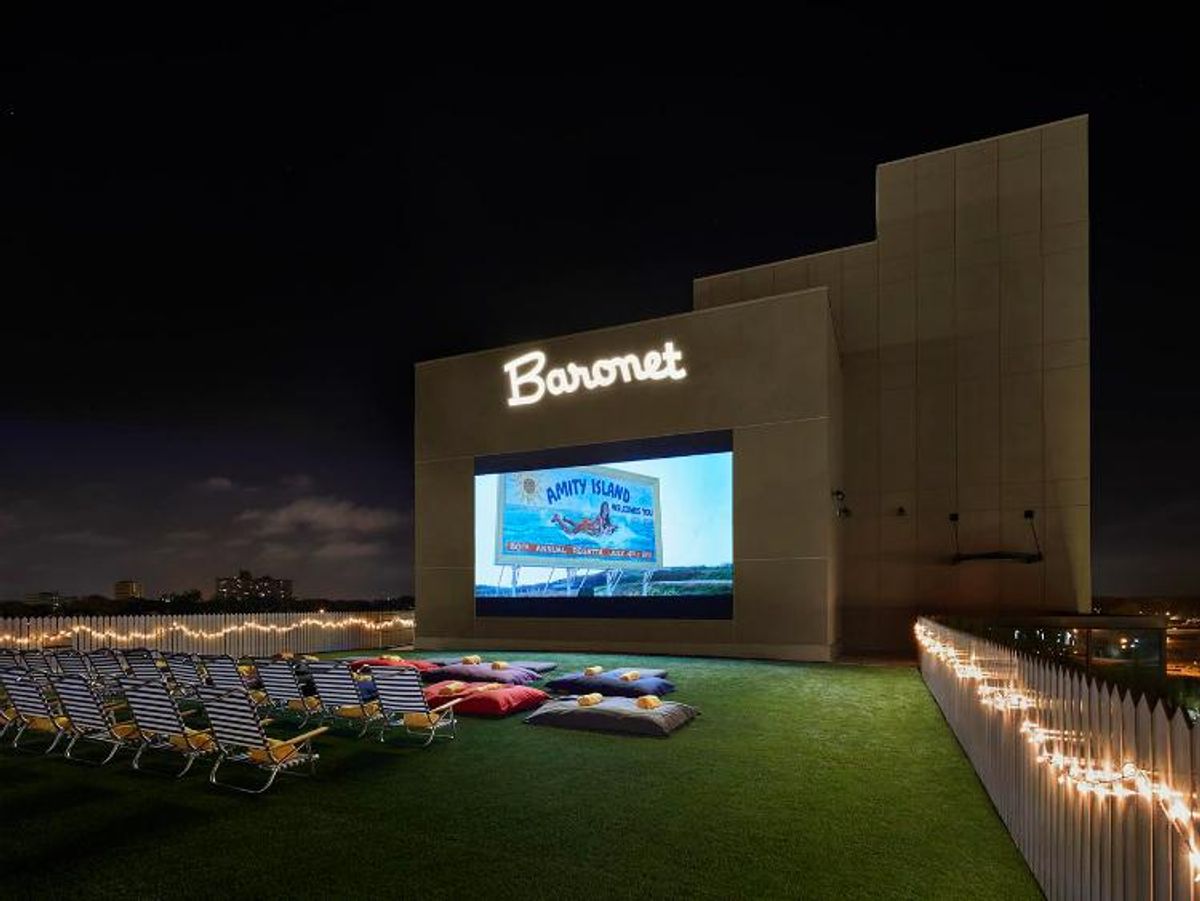 Salvation, the aptly named bar on the top of the property, has been drawing an eclectic crew of clubbers mirroring the different stripes of beachgoers since the hotel’s soft opening over Memorial Day Weekend. And Baronet, the astroturfed roof deck on the fifth floor, screens movies regularly (think: Top Gun and The Adventures of Priscilla, Queen of the Desert) for guests and locals alike.