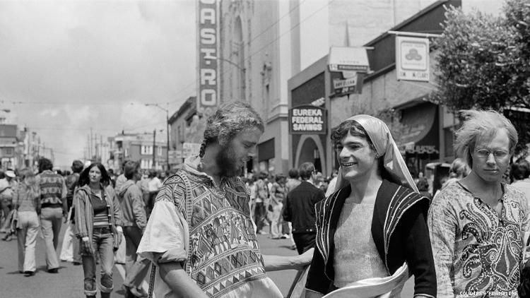 Image: Frameline founder Marc Huestis (right) in front of the Castro theatre in the 1970s