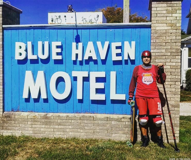 Skate of the Union continues as Laughlin Artz stops for a shot at the Blue Haven Motel in Osceola, IA