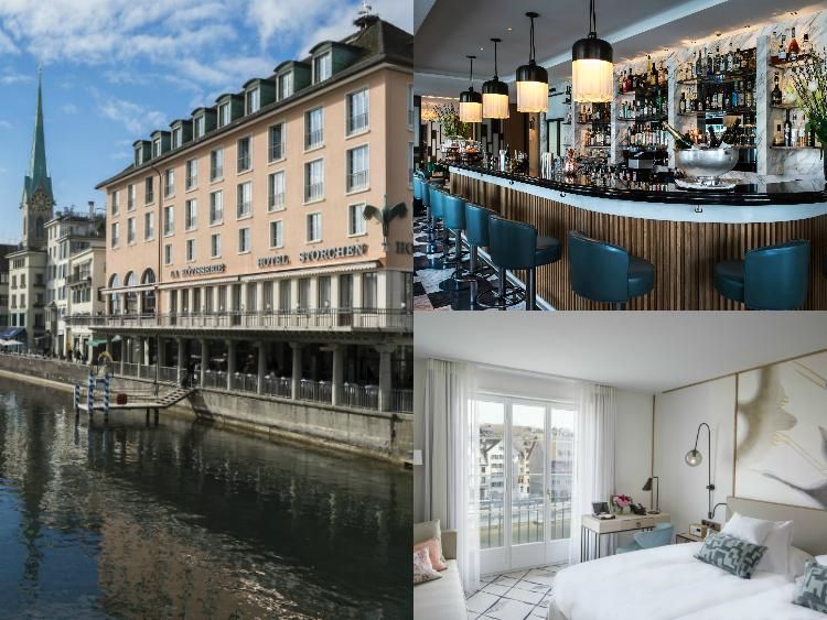Left: Exterior of the Storchen Zürich Hotel. Top right: Interior of the bar at Barchetta. Bottom right: Guest room at the Storchen Zürich Hotel.